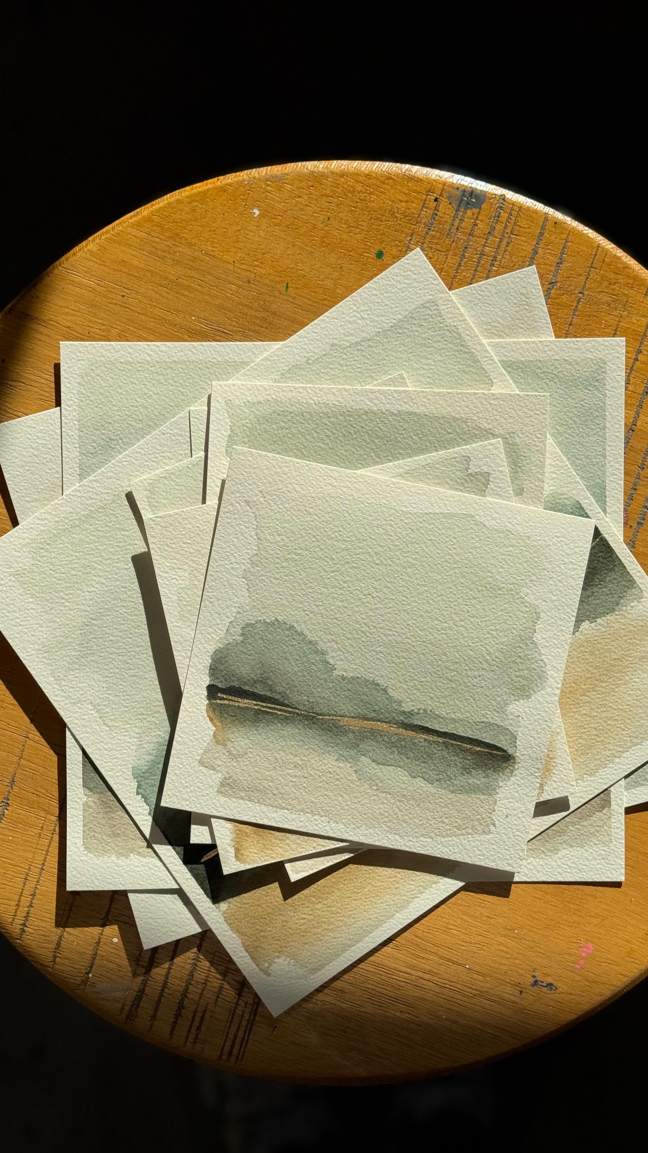 “Where Time Stands Still” is an original acrylic watercolor landscape with gold detail on 4×6” watercolor paper.